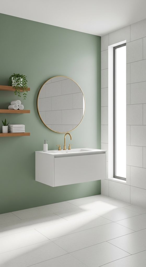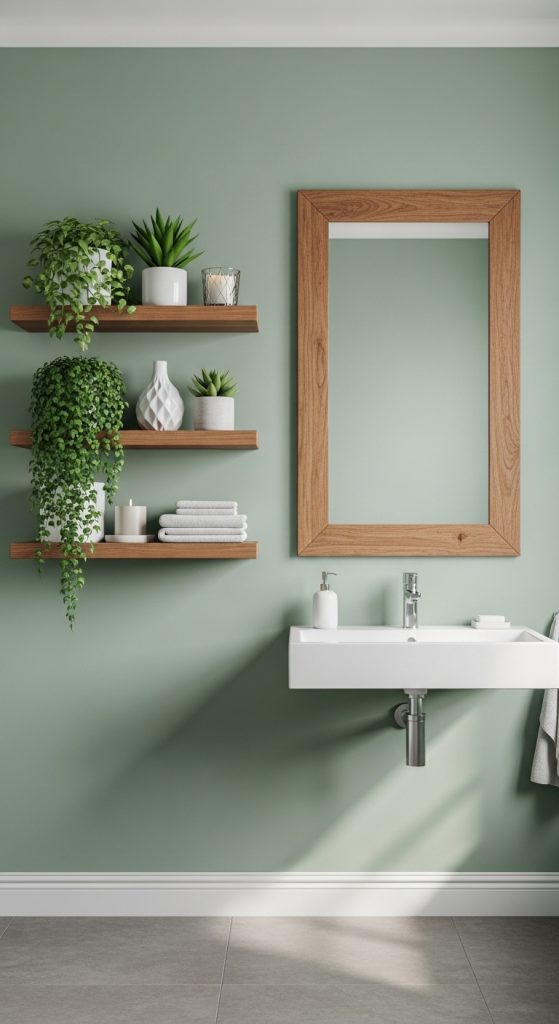 Choose moisture-resistant paint designed for bathrooms to prevent mold and peeling. Pair the sage green wall with white tiles and wooden shelves for a balanced look. This simple change can make your bathroom feel calm, modern, and fresh.