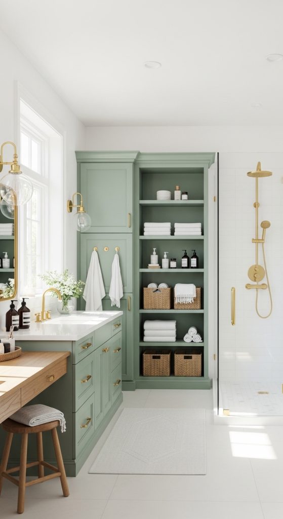 Installing sage green cabinets or storage units can create a strong design statement. This works well in larger bathrooms with enough space for extra storage.
