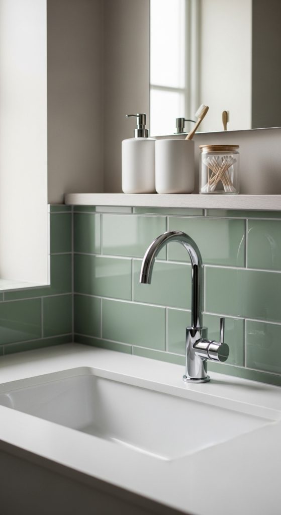 Sage green subway tiles paired with white grout create a clean, classic look. For a modern style, you can use darker grout for contrast. This decor idea adds color while keeping the bathroom practical and easy to clean.