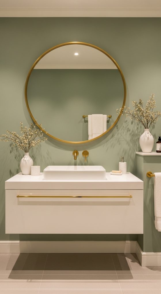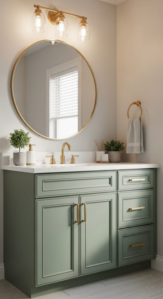 Sage green cabinets paired with white walls and gold handles create a stylish and modern look. This idea adds both color and functionality to your bathroom.
