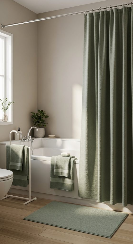 Start by choosing a shower curtain made of waterproof or mildew-resistant material. Cotton or microfiber towels in sage green add softness and comfort. Make sure the shade of green matches well with your existing walls and tiles.