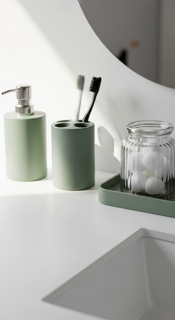 Small decorative accessories can make a big impact. If you do not want major changes, use sage green in soap dispensers, toothbrush holders, storage jars, and trays.