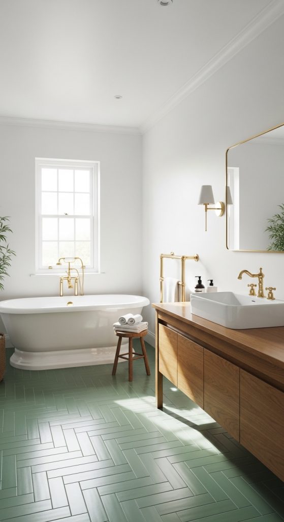 Installing sage green floor tiles is a bold but beautiful choice. It adds color while keeping walls neutral.