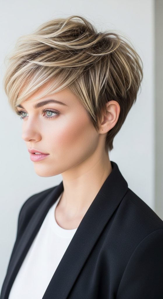 Begin by washing and conditioning the hair, then gently towel dry and detangle. Section the hair into layers starting at the nape, cutting short lengths to form a clean base. Gradually work upward, using point-cutting techniques to create texture and prevent blunt edges. The top layers should be left slightly longer to allow for styling versatility. After cutting, apply texturizing spray and use fingers to tousle the hair, emphasizing natural movement. For a polished finish, a small round brush and blow dryer can be used to smooth sections selectively. Regular trims every 4–6 weeks maintain the shape and texture of the pixie cut. Planning the haircut according to face shape ensures the style highlights key features. This step-by-step method provides beginner friendly guidance while encouraging creative exploration, making the textured pixie a practical, trending, and aesthetically appealing short hair style.