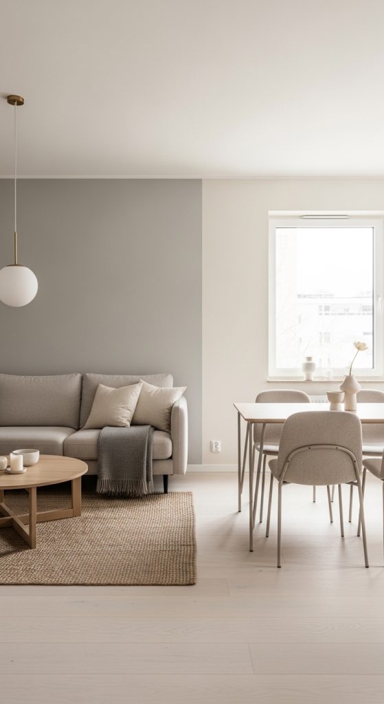 Neutral color harmony focuses on using soft, balanced tones to create visual unity across living and dining areas. This approach reduces visual clutter and enhances spatial perception in small rooms. It is widely used in minimalist style interiors.