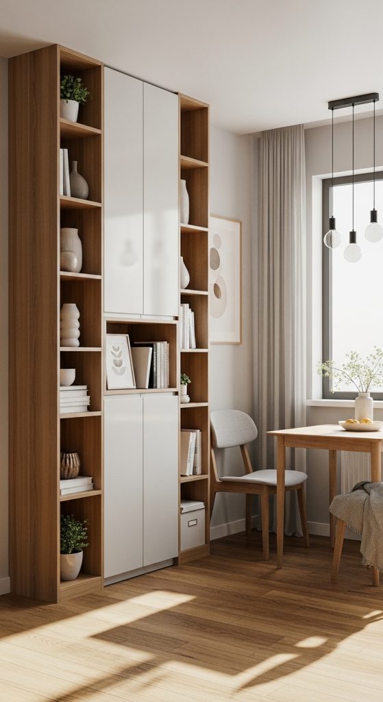 The concept includes wall shelves, vertical cabinets, and hanging storage systems that keep items off the floor. This improves movement flow and makes the room feel taller and more open. It aligns with modern design principles and is frequently used in Pinterest ideas for small apartments.
