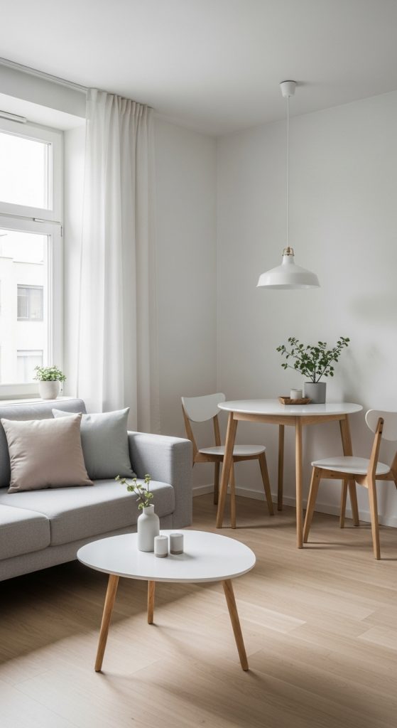 This idea is ideal for apartments where flexibility is important. The dining area can be hidden or minimized when not in use, allowing the living room to remain open. It is often featured in Pinterest ideas because it combines practicality with modern design. The setup works well in narrow rooms where traditional dining tables may feel overwhelming.