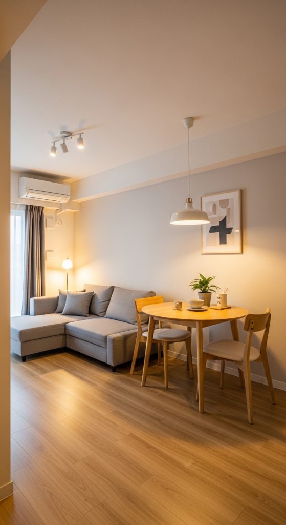 Lighting should be layered strategically. Use ceiling lighting for general brightness and add focused lighting above the dining area. This helps define separation without physical dividers. Maintain consistent color tones across both zones to enhance unity. Neutral shades often work best in small layouts. The final result should feel open, balanced, and functional, supporting both relaxation and dining activities without disruption.