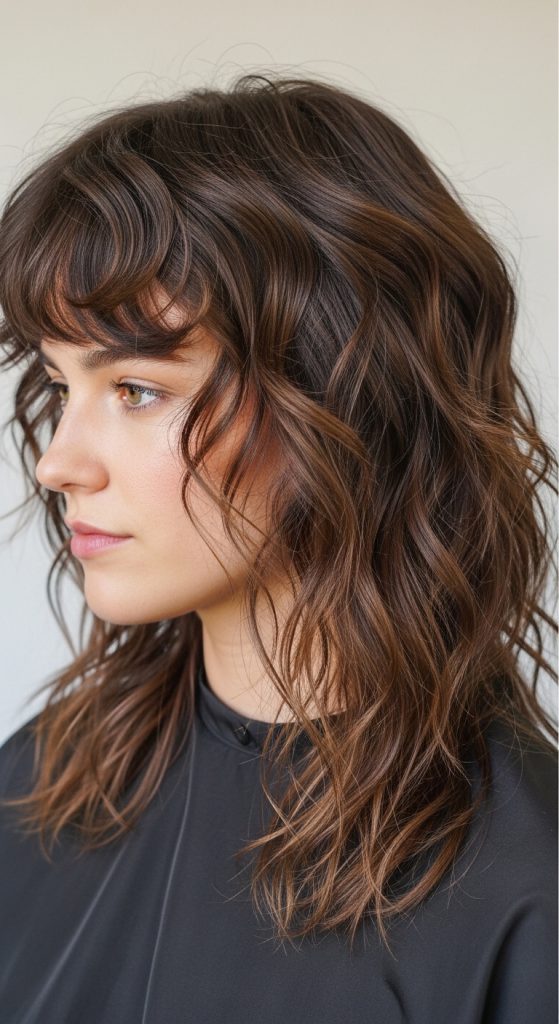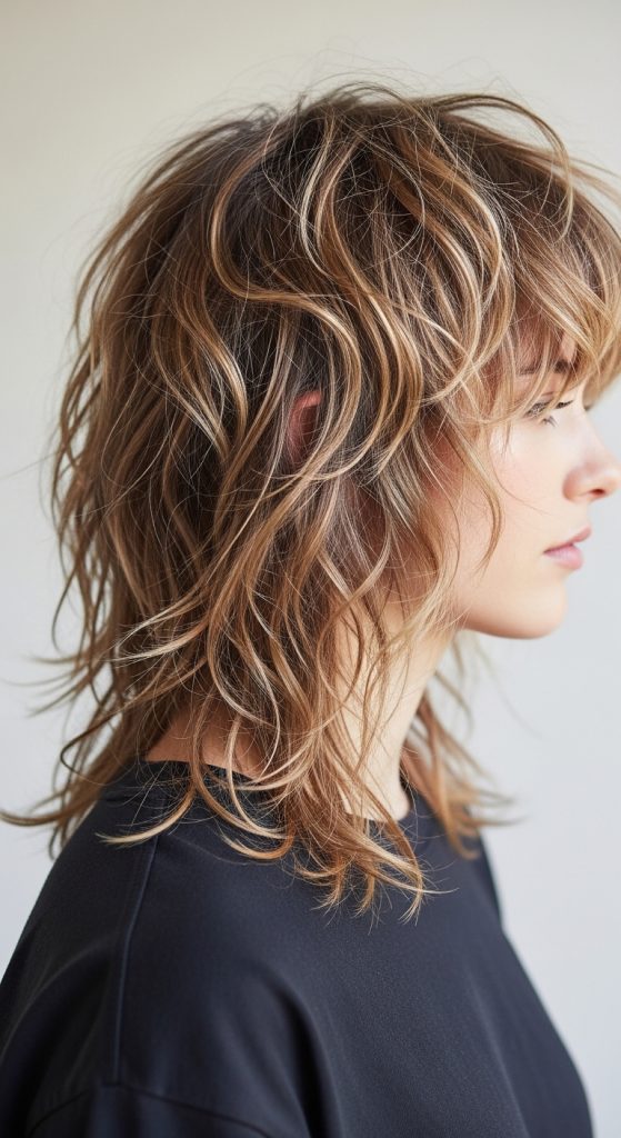The shaggy wavy mullet emphasizes relaxed texture and casual volume, creating a carefree, modern aesthetic. This style integrates uneven layers and slightly tousled waves, resulting in a soft, lived-in appearance. The shaggy effect enhances natural movement, making it suitable for all hair types. Unlike rigid cuts, this design allows for flexible styling and effortless transition from day to night looks. Its beginner-friendly nature stems from minimal precision requirements, allowing small imperfections to contribute to the overall charm. Additionally, the style complements both minimalist and bold accessories, reflecting the versatility of trending Pinterest ideas. The wavy perm ensures long-lasting texture, reducing reliance on heat styling tools and supporting low-maintenance upkeep.